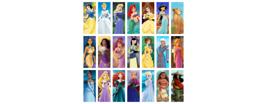 Biancaneve, Cenerentola, Aurora, Ariel, Belle, Jasmine, Pocahontas, Mulan, Tiana,Rapunzel,Elsa Frozen,Anna Frozen,Merida,Vaiana Oceania.
